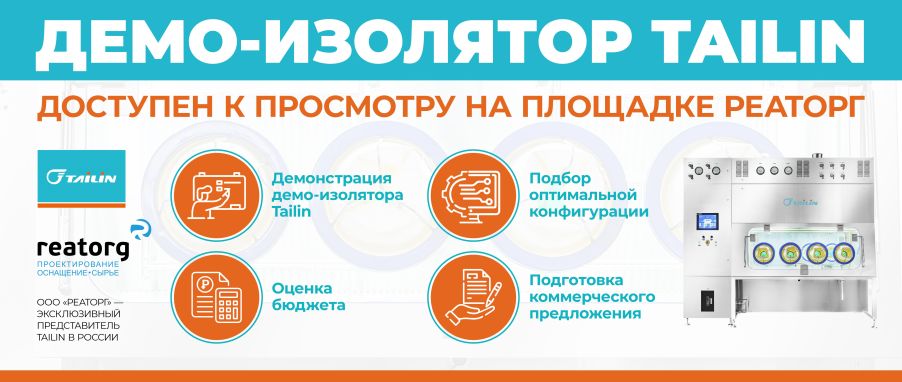 На площадке компании РЕАТОРГ доступна демонстрация изолятора для тестирования на стерильность от ведущего китайского производителя Tailin Bioengineering,  занимающего лидирующие позиции в разработке технологий и продуктов, связанных с системами для тестирования и контроля на микробиологическую чистоту.
