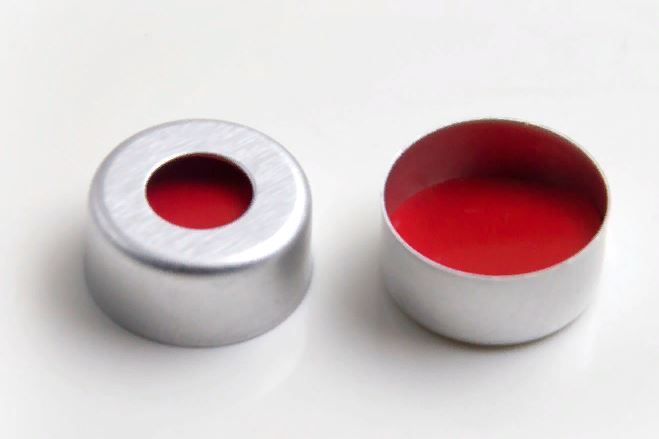 Расходные материалы для лабораторного хроматографического анализа: крышки обжимные с септой, материал алюминий с красной септой политетрафторэтилен, 11 мм, цвет серебристый, 1000 шт/уп