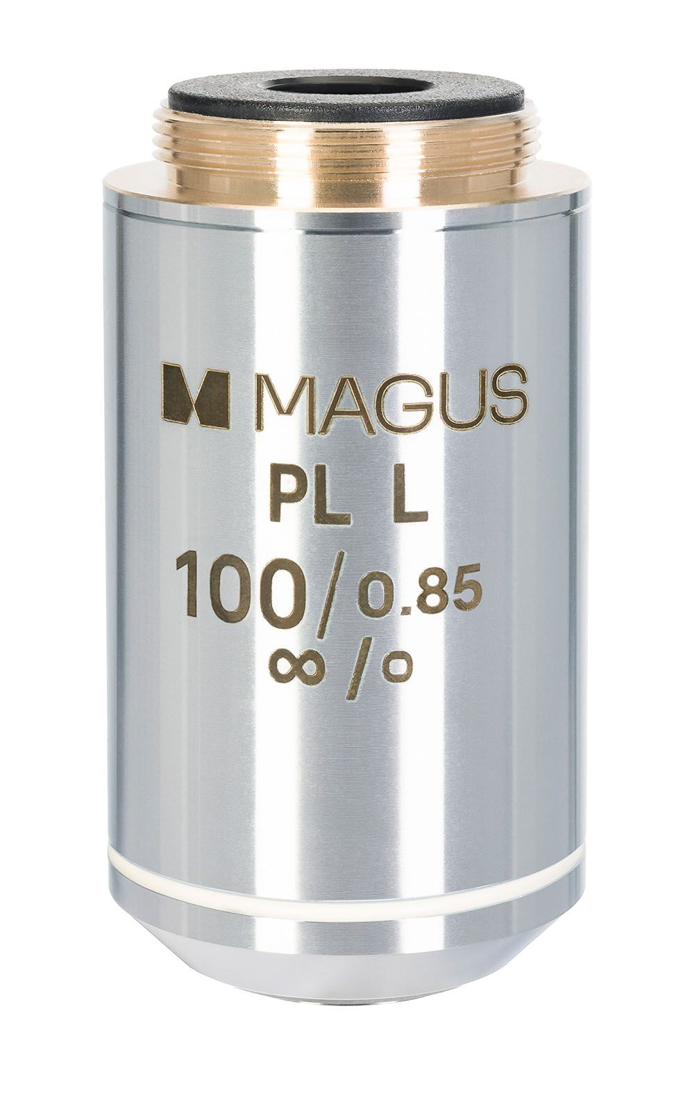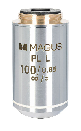 Объектив с увеличением 100 крат. Лучше всего проявляет себя при использовании окуляров кратностью от 5х до 10х. Эта комбинация создает полезное увеличение микроскопа в пределах от 425 до 850 крат. Меньшая кратность не позволит рассмотреть объект достаточно подробно, большая не даст новой информации.