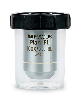 Объектив рассчитан на длину тубуса «бесконечность». Парфокальная высота 45 мм. При работе с окуляром 10х/22 мм диаметр поля зрения составит 0,22 мм. Рассчитан для работы с образцами без покровного стекла.