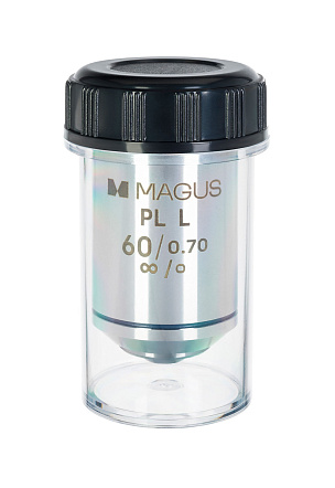Кратность объектива – 60х. Полезное увеличение микроскопа с установленным объективом 60PLL находится в промежутке от 350х до 700х. С меньшей кратностью не удастся разглядеть мелких деталей, а большая не даст новой информации. Получить полезное увеличение можно при комбинации объектива с окулярами от 5х до 15х. Модель объектива 60PLL имеет предел разрешения 0,39 мм.