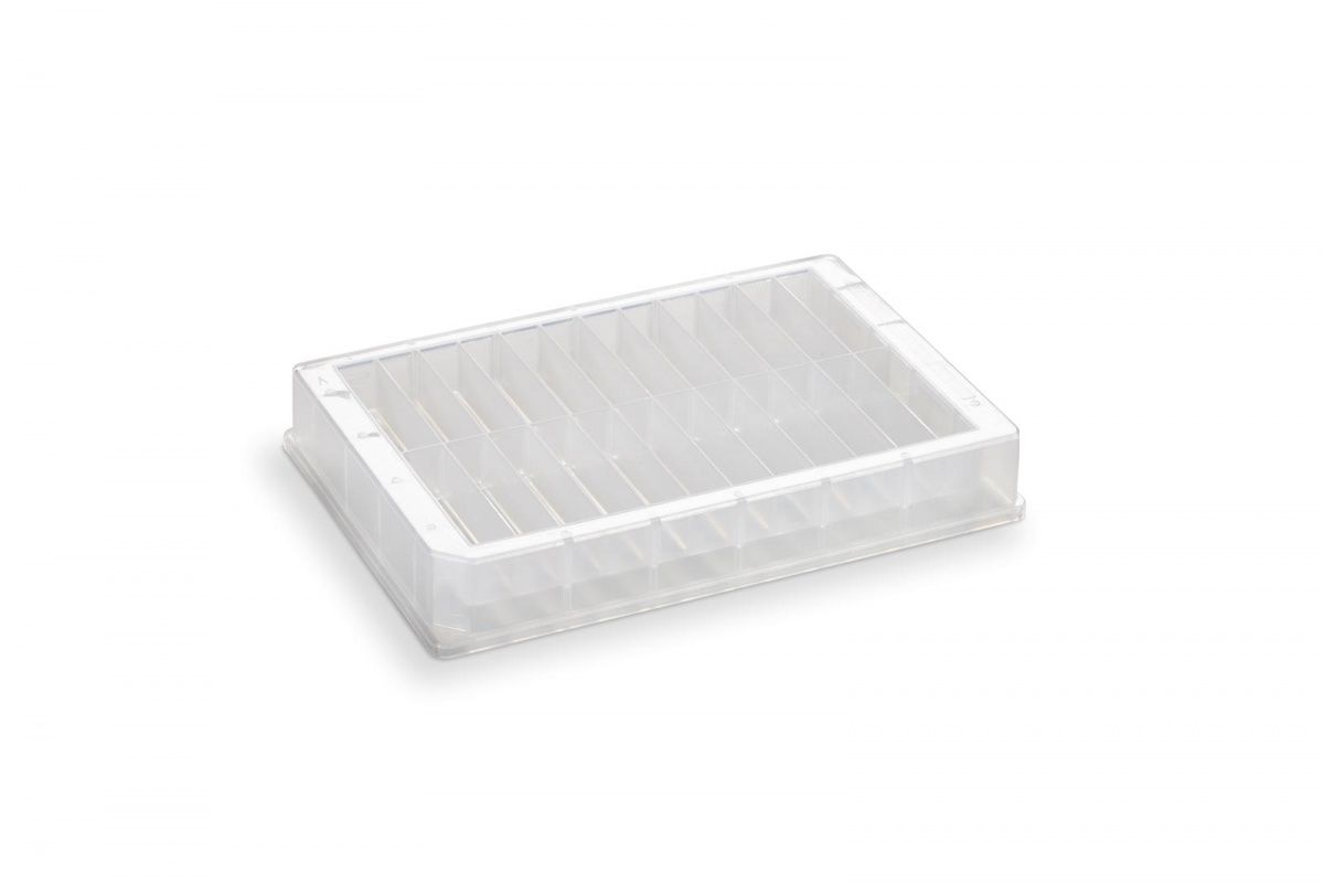 Резервуар из полипропилена с 24 уникальними полостями, 2 ряда по 12 колонок, объем колонки 3,5 мл, максимальный объем 84 мл, пирамидальная форма дна, высота 19 мм, облученный, 25 шт/уп. Планшеты стерилизованы гамма-излучением.