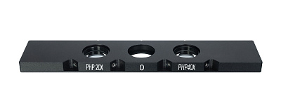 Слайдер – это небольшая пластина для установки в слот конденсора микроскопа. Имеет три отверстия круглой формы: одно – с фазовой вставкой для объектива 20х, второе – свободное для светлопольных наблюдений, третье – с фазовой вставкой для объектива 40х. Слайдер позволяет быстро переключаться со светлого поля на фазовый контраст и обратно, что упрощает рутинную работу исследователя. Перед использованием необходимо отцентрировать фазовые вставки слайдера, чтобы они соответствовали фазовым кольцам объективов. Это делается при помощи вспомогательного центрирующего телескопа – он входит в базовую комплектацию микроскопа MAGUS Bio V300.