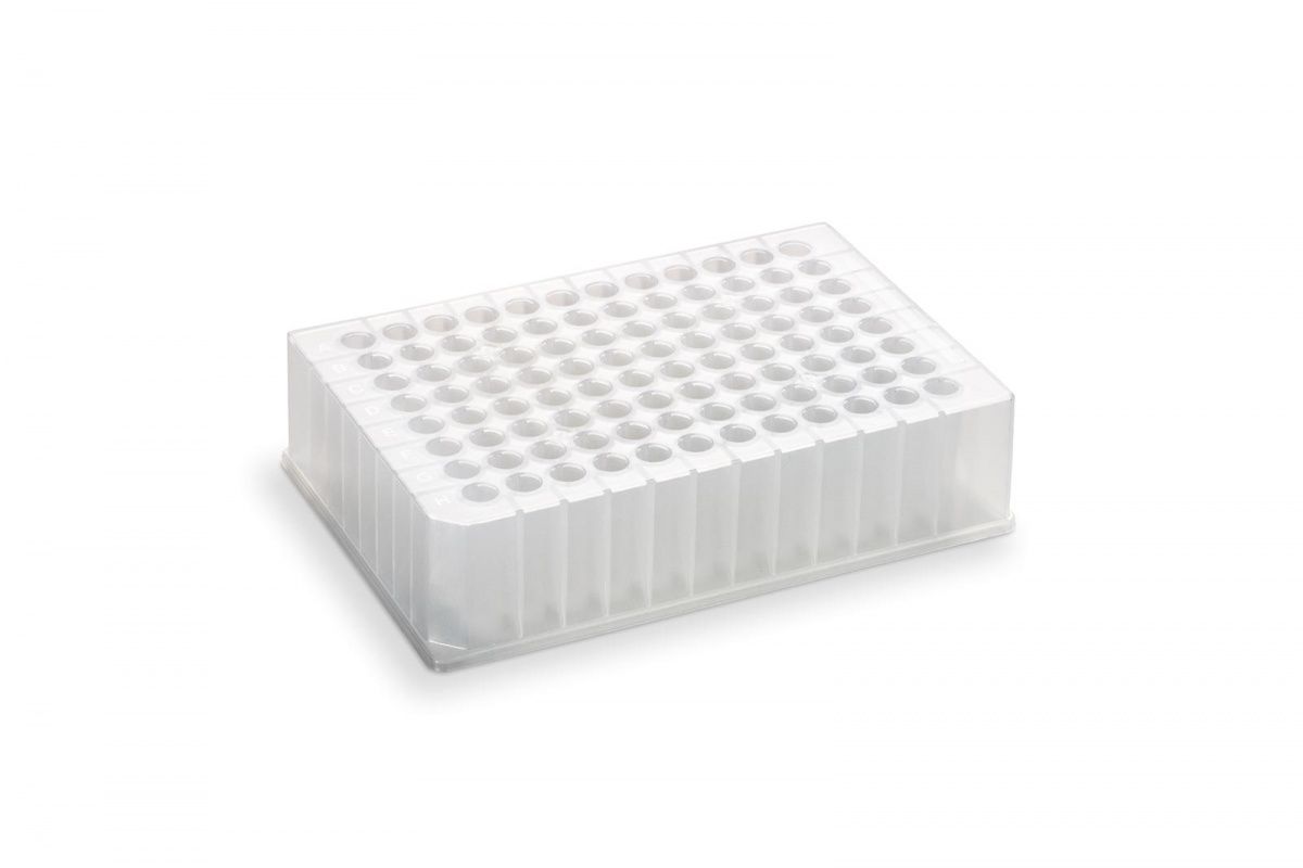 Расходные материалы для лабораторного хроматографического анализа: 96-луночный микропланшет для хранения и анализа, из полипропилена, облученный, квадратная лунка объемом 1,1 мл, общий объем 105,6 мл, коническое дно, высота 30,6 мм, глубина лунки 25,78 мм. Планшеты стерилизованы гамма-излучением. 25 шт/уп