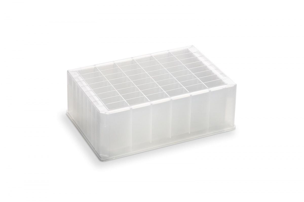 48-луночный микропланшет для хранения и анализа (8 рядов по 6 колонок), из полипропилена, облученный, прямоугольная лунка объемом 5 мл, общий объем 240 мл, пирамидальная форма дна, высота 44,04 мм, глубина лунки 42,08 мм, 25 шт/уп. Предлагается крышка к данной планшете №202497-100. Планшеты стерилизованы гамма-излучением.