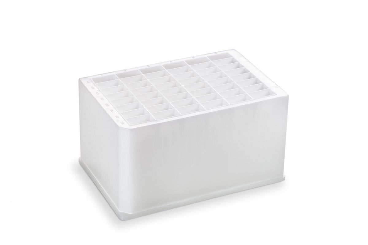 48-луночный микропланшет для хранения и анализа (8 рядов по 6 колонок), из полипропилена, прямоугольная лунка объемом 7,5 мл, общий объем 360 мл, пирамидальная форма дна, высота 68,33 мм, глубина лунки 63,5 мм, 15 шт/уп. Предлагается крышка к данной планшете №201156-100.