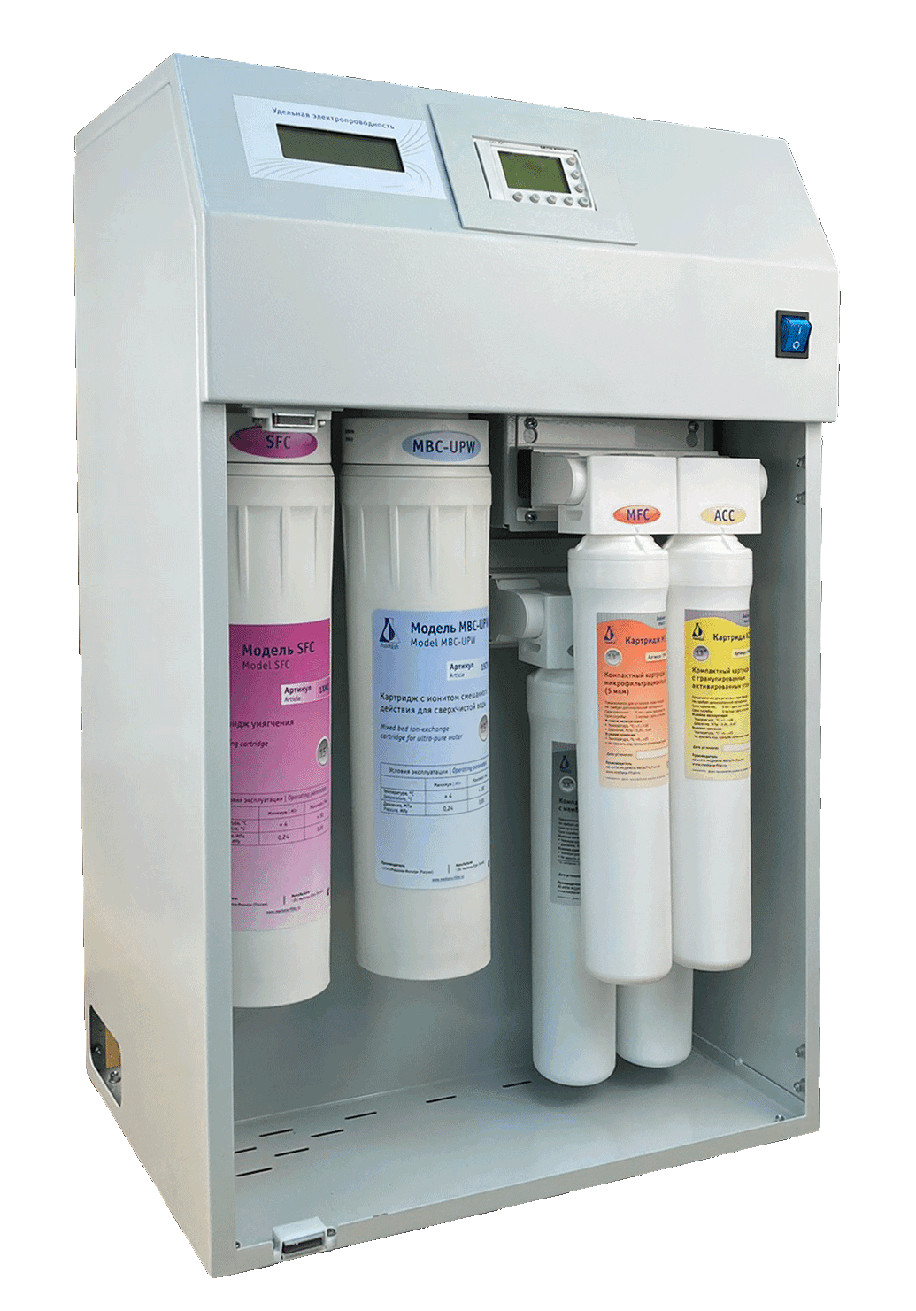 Назначение: Получение воды степени чистоты 1 по ГОСТ Р 52501-2005 «Вода для лабораторного анализа», воды типа I по ASTM D1193-06(2011), ISO 3696, воды CLRW по CLSI, а также воды, соответствующей требованиям ФС.22.0020.18 «Вода очищенная», ФС.22.0019.18 «Вода для инъекций» и другим стандартам для ультрачистой воды.