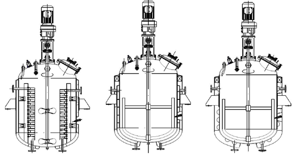 Рис.5 Слева направо: Реактор c внутренним трубчатым змеевиком и пропеллерной мешалкой; Реактор c U-образной рубашкой и рамной мешалкой; Реактор с полутрубной рубашкой и рамной мешалкой.